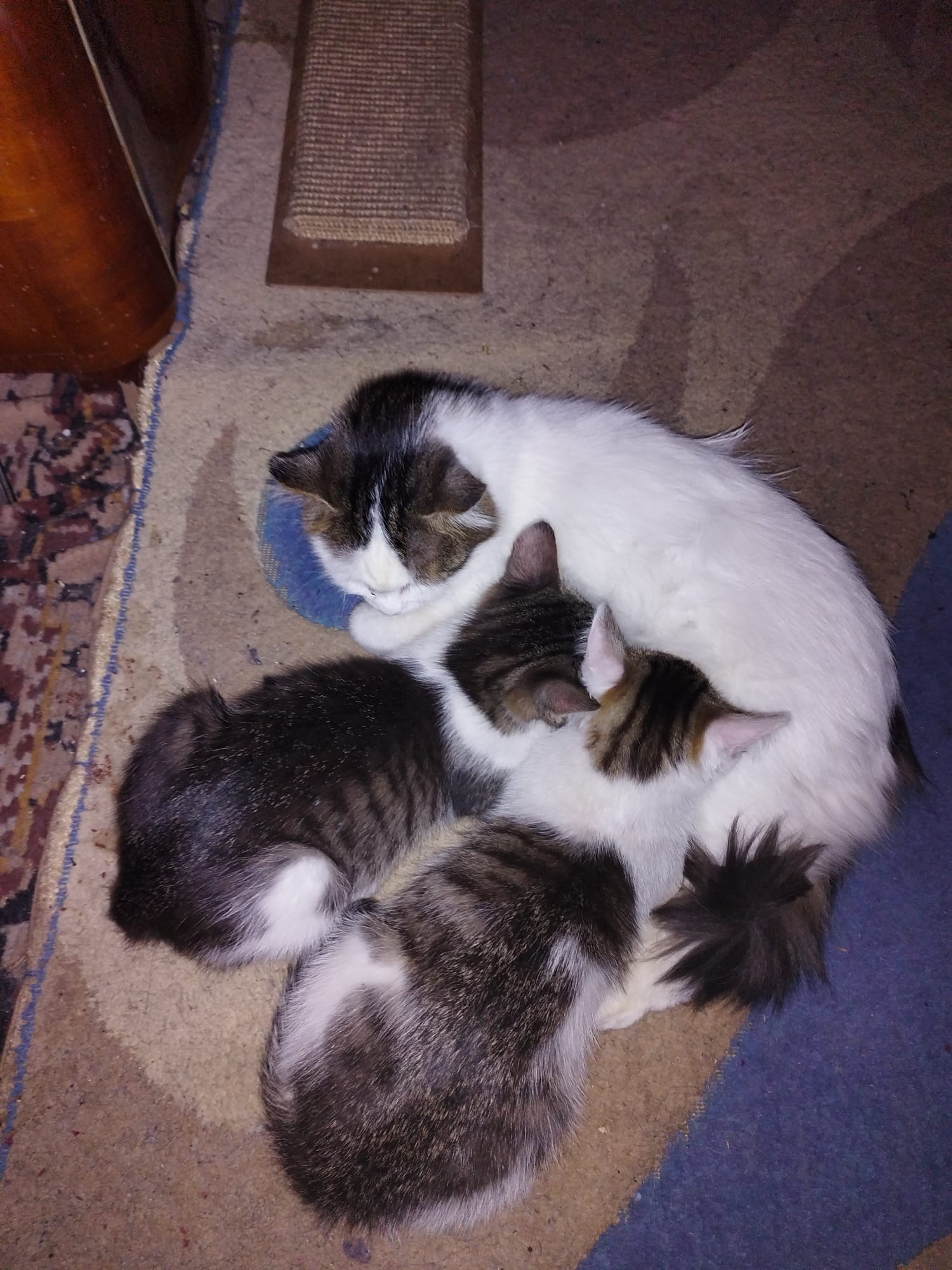 Una peste alta, Baba Oarba, cum îi spunem pisicii, şi-a revenit nesperat de bine. Ba mai mult, la vreo două luni după ce am adoptat-o, ne-a făcut şi trei pisoi. Când i-am dat vestea doctoriţei Ramona Dan, salvatoarea ei… „Nu pot să cred, n-am mai pomenit aşa ceva”, a fost reacţia dnei Dan. Ulterior, din discuţiile purtate cu alţi veterinari, am conchis că naşterile la pisici în vârstă de peste 10 ani sunt rarităţi. Iar una de 14 ani, cum e cea despre care e vorba aici, care să fi născut pui perfect sănătoşi, are toate şansele să stabilească un record naţional.